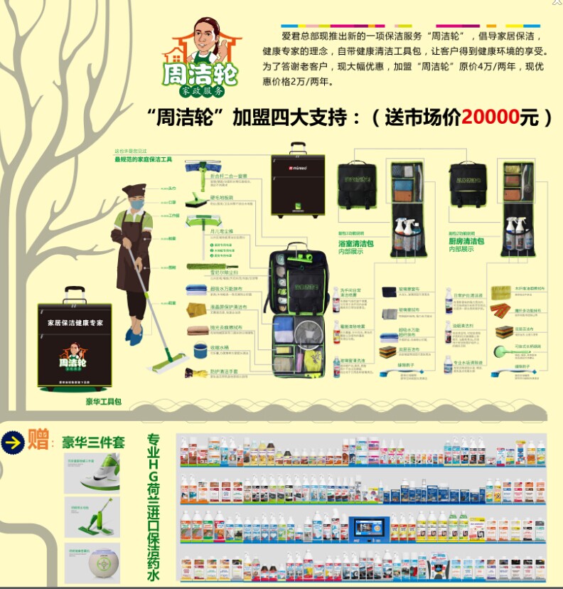 2.加盟周洁轮保洁项目,现场现金奖励2000元。(此双重优惠可以叠加)