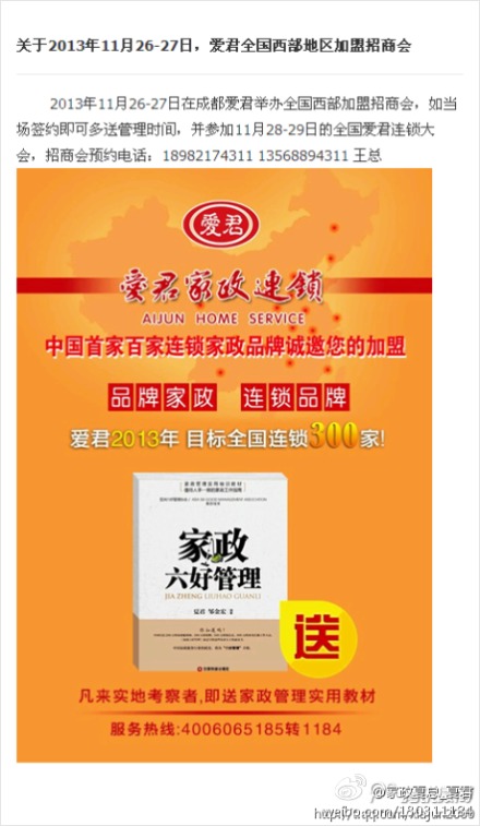 爱君品牌家政 特许加盟国家商务部备案公告 备案号:0310502000900008